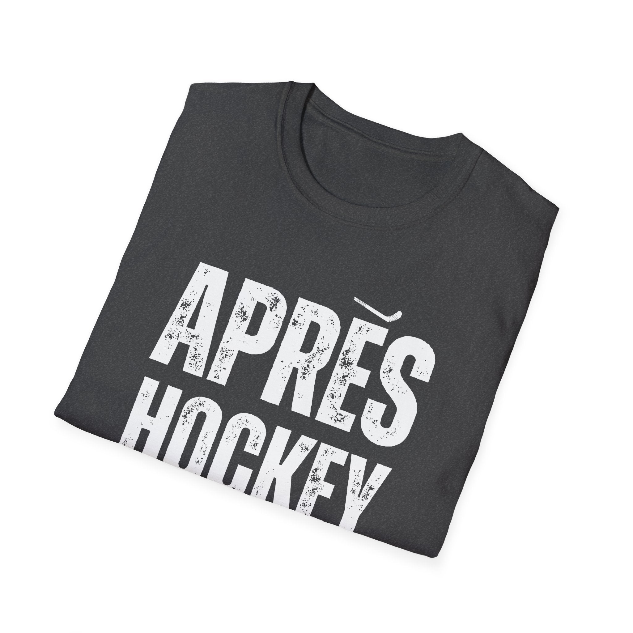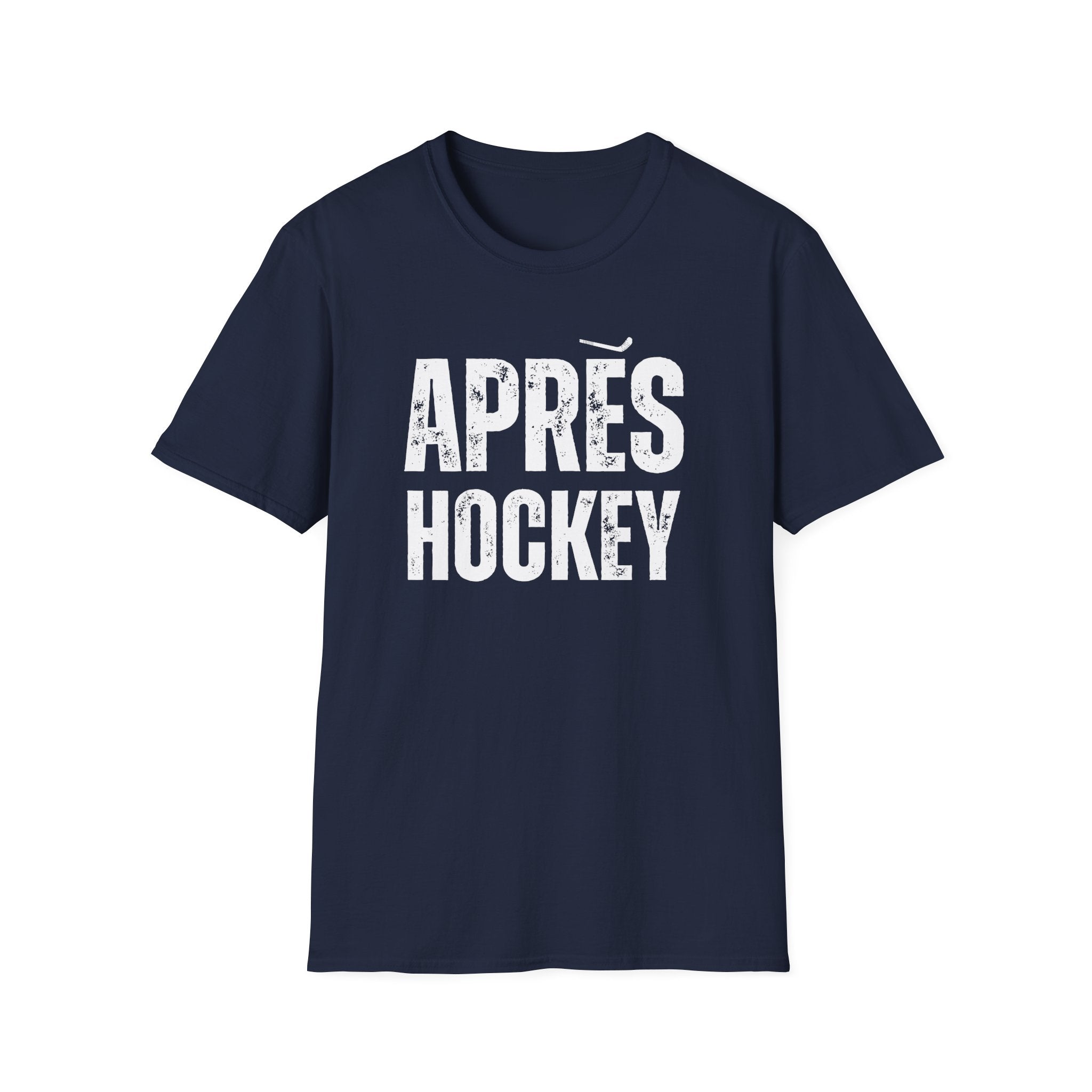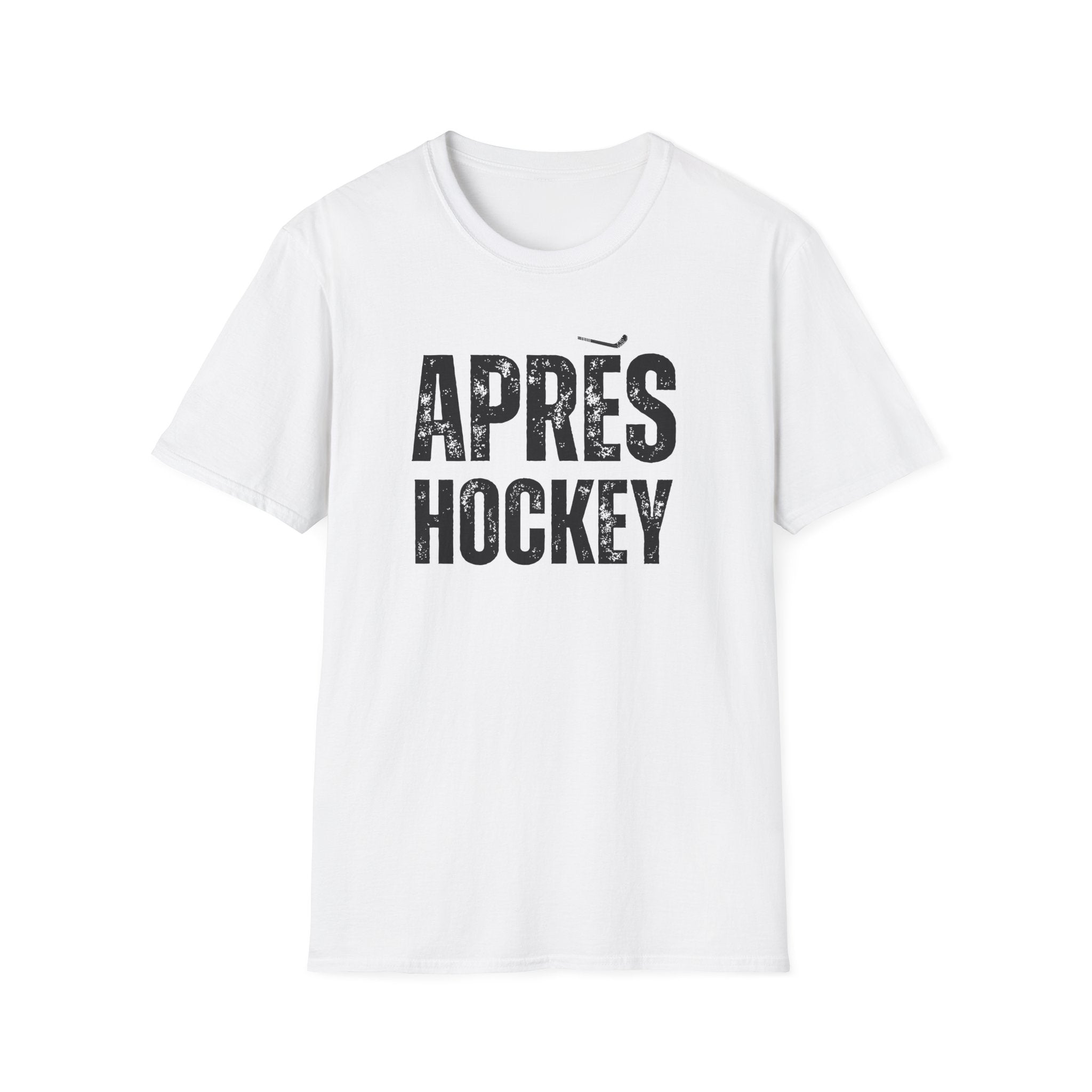 Lightweight and easy-going, this crewneck tee carries a scratched, vintage-type graphic that reads “APRÈS HOCKEY.” The worn lettering and simple monochrome print keep the look low-key and honest: Rock it on post game "safety meetings" and out-of-town tourneys. The fabric breathes, the collar keeps its shape, and the shirt moves with you when you’re heading from rink to pub or back to the car.